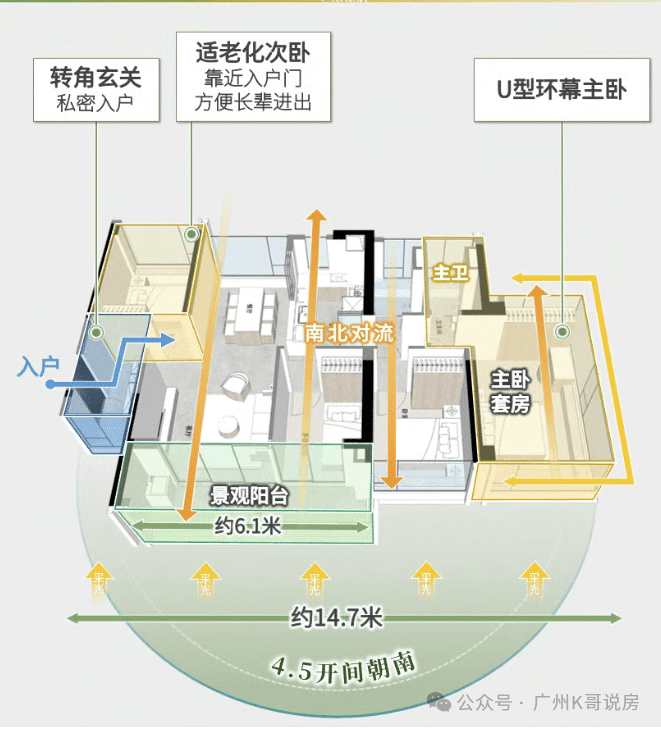 建面约 111㎡南向四房户型,是项目专为改善家庭打造的全能型改善户型,该户型采用南向约 14.7 米的超大面宽设计,实现了 4.5 个开间朝南,三面环幕的采光布局,让室内实现了全明通透的采光效果,无论白天哪个时段,都能享受到充足的南向阳光。户型打造了约 6.1 米的宽景观景阳台,与北向的生活阳台形成完美的南北对流,让室内拥有极佳的通风效果,完美适配广州的气候特点,夏日可实现自然降温,无需长时间开启空调,提升居住的舒适度。户型采用 LDKB 无界方厅设计,客厅、餐厅、厨房、阳台四大空间无缝衔接,打造了超大尺度的家庭公共互动空间,既提升了室内的空间感与通透感,又为家庭互动、朋友聚会、家庭聚餐等多元化生活场景提供了充足的空间。四个卧室分布在户型的四角,与公共活动区完美分隔,实现了极致的动静分区,保证了每一间卧室的私密性与安静度,互不干扰,完美适配多孩家庭、三代同堂家庭的居住需求。主卧采用套房设计,配备了独立的卫生间与全景飘窗,预留了大容量步入式衣帽间的位置,打造了专属的主人私密空间,提升了居住的品质感与舒适度。整体户型布局方正,空间使用率极高,无任何浪费面积,无论是空间尺度、采光通风、景观视野还是功能实用性,都做到了极致,是改善家庭入主海珠核心的全能优选户型。