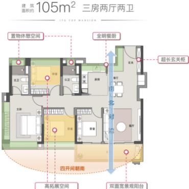 国贸云上聚焦改善型家庭居住需求,打造多款高实用率、全明通透的主力户型,其中建面约85㎡三房两厅两卫与建面约105㎡四房两厅两卫为市场热销爆款,兼具空间实用性与居住舒适度。建面约85㎡三房两厅两卫户型,作为白云率先执行新规的产品,实用率超100%,空间零浪费。户型采用户户朝南设计,全明通透格局,采光通风俱佳,最大化引入自然光线与园林景观。LDK一体化灵动空间设计,打破传统空间隔阂,增强家庭互动性与空间通透感,兼顾实用性与仪式感。主卧为套房设计,配备独立卫浴与观景飘窗,保障主人居住私密性与尊贵体验;次卧空间宽敞,可作为儿童房、老人房或书房,功能灵活多变;公共卫浴干湿分离,提升使用效率与整洁度。建面约105㎡四房两厅两卫户型,空间尺度更为阔绰,南向超大面宽设计,客厅与双卧室朝南,尽享阳光与景观。户型方正无浪费空间,高实用率赋予居住更多实用面积,可满足二胎家庭或三代同堂居住需求。主卧套房配备独立衣帽间与卫浴,品质感十足;多功能房可根据家庭需求改造为书房、健身室或儿童游乐区,满足多元化居住需求。两款户型均遵循人体工程学设计,空间布局科学合理,是城芯改善置业的优选户型。