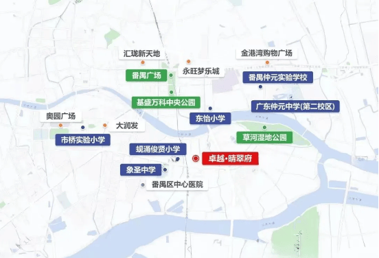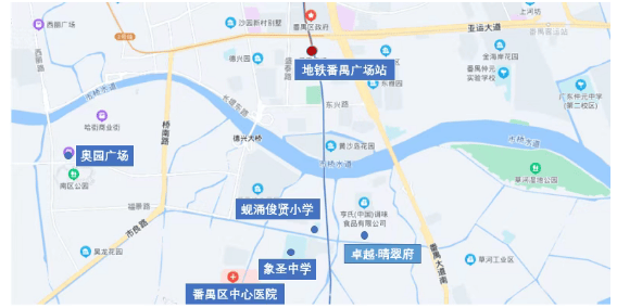 教育资源是项目的一大优势,距离小区 800 米有诺宝幼儿园,3 公里内有蚬涌俊贤小学、象圣小学、象圣中学、广东番禺中学等学校。其中市桥实验小学蚬涌俊贤学校步行约 300 米,桥城中学集团象圣学校步行约 600 米,市桥实验小学为广州市一级学校,桥城中学中考成绩连续 16 年居番禺区公办学校首位,教育实力强劲(具体招生地段以教育局公布为准)。景观方面,项目距离市桥水道直线距离 400-500 米,中高楼层可眺望江景,享受自然景观资源。