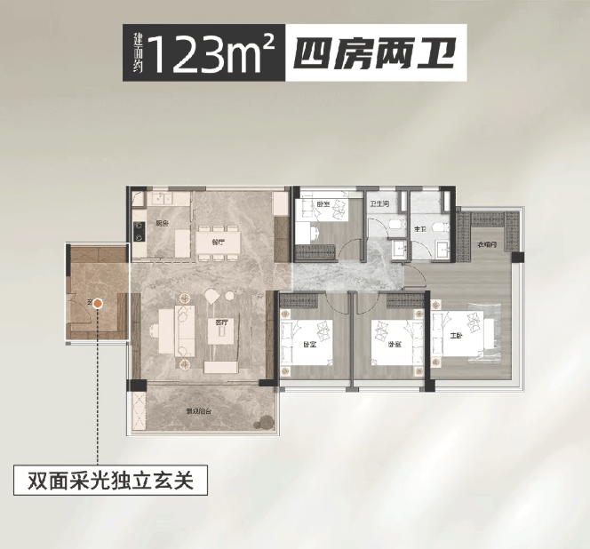 建面约123㎡ 四房两卫:奢阔横厅设计,客厅开间约4.5米,主卧套房配置步入式衣帽间,改善生活品质的进阶之选。