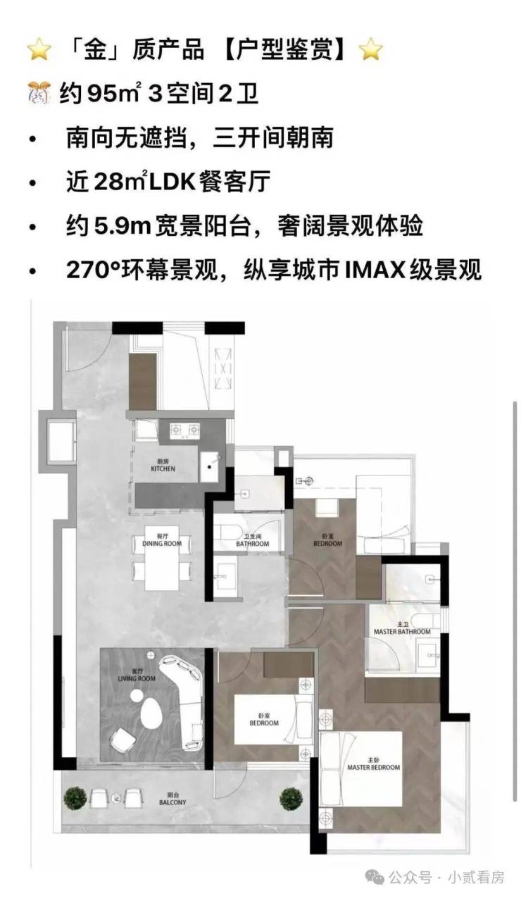 约95㎡三房两厅两卫:作为入门改善的优选,该户型做到了全屋三开间朝南,LDKB一体化设计让约28㎡的公共空间通透开阔。约5.9米超长阳台兼具景观与功能,创新凹墙设计极大增强了收纳系统性。它完美诠释了如何在有限面积内,通过精妙设计实现空间利用最大化与居住舒适度的平衡。