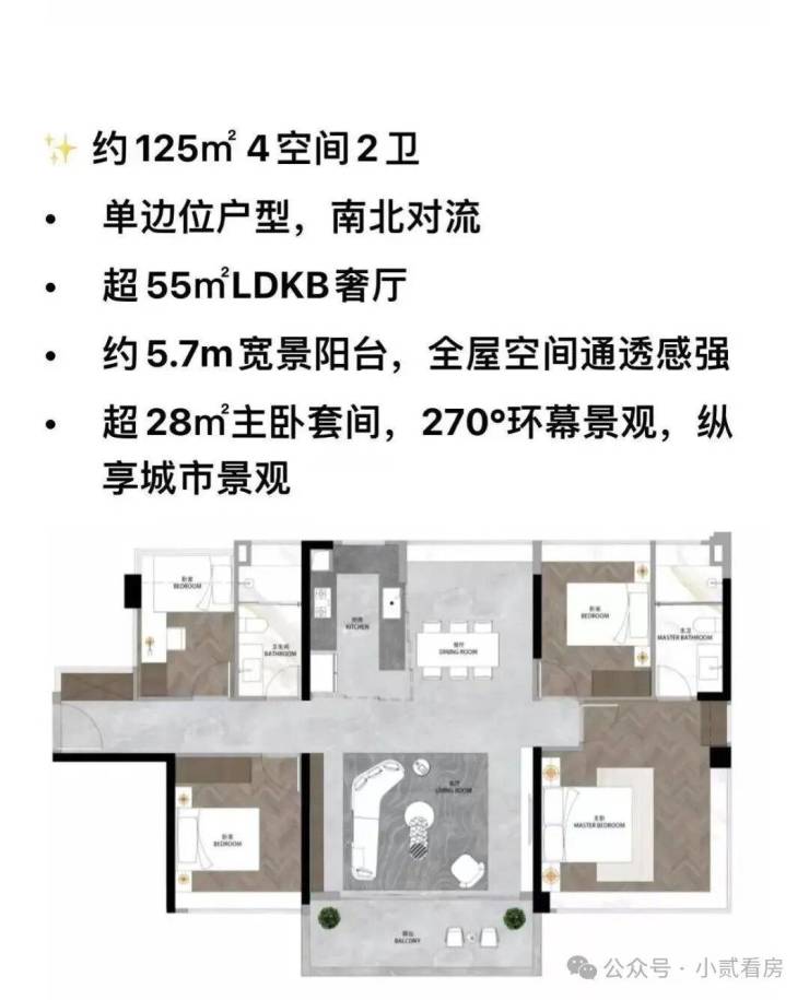 约125㎡四房两厅两卫:此户型将改善体验推向新高度。单边位设计实现三面采光与南北对流,约55㎡的奢阔LDKB厅创造了真正的“家庭核心区”,社交厨房岛台与餐桌形成双洄游动线。约28㎡的豪华主套拥有270°观景视野,居住尊崇感油然而生。
