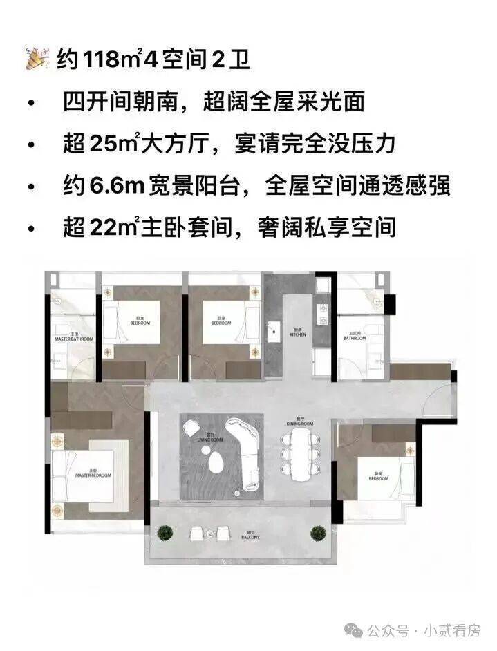 约118㎡四房两厅两卫:堪称改善家庭的“黄金户型”。南北通透、四开间朝南,格局方正。约6.6米的IMAX级宽景阳台,带来了媲美大平层的空间感与景观面。独立玄关、U型厨房、以及带独立衣帽间和卫生间的“三进式”主卧套房,全面满足了多代同堂家庭对功能、舒适与私密性的所有想象。
