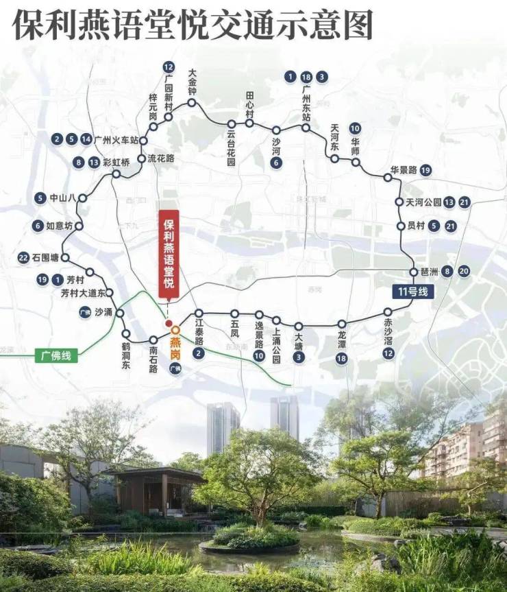 项目紧邻广佛线与广州地铁11号线交汇的燕岗站,步行仅需几分钟即可到达。这一地理位置的优势是显而易见的。广佛线作为连接广州与佛山的重要轨道交通线路,不仅极大地缩短了广佛两地的时空距离,更带动了沿线区域的经济发展。而广州地铁11号线作为广州首条地铁环线,串联起了全市的主要交通枢纽和核心功能区,被誉为“广州地铁的大动脉”。