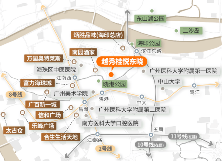 轨道交通:项目距地铁8号线晓港站仅约600米,步行10分钟即可到达。8号线作为广州东西向的大动脉,连接了琶洲人工智能与数字经济试验区、珠江新城、客村等重要商圈。1站昌岗换乘2号线直达白云机场方向,3站客村换乘3号线直通天河CBD。30分钟内,即可通达广州最核心的商务与生活区域。