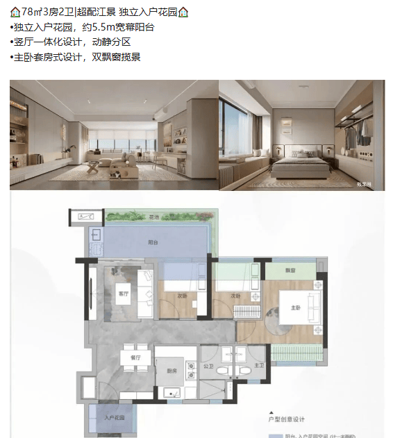 社区以“公园家”为设计理念,打造“一轴一街一带十六景”的全龄健康生活系统。内部园林融合运动跑道、儿童游乐区、长者休憩角等功能模块,倡导无界共享的邻里互动。高楼层部分单位可俯瞰沙湾水道一线江景,推窗见水,生态氛围优于同价位竞品。虽未设传统高端会所,但通过架空层泛社交空间与社区商业联动,营造出兼具活力与松弛感的日常场景。2.8米层高略低于市场主流(通常2.9–3米),但在百万级产品中仍属合理配置。