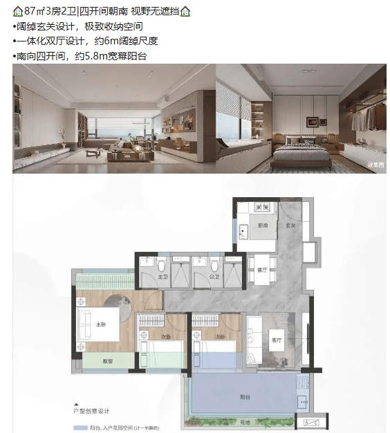 户型全面贯彻广州超新规标准,实用率突破110%,空间效率领先市场。建面约78㎡三房两卫配置独立入户花园与5.5米宽幕阳台,部分单位享江景视野;84㎡户型实现四开间朝南、南北对流,超11米采光面提升通透感;87㎡优化双厅一体化布局,南向四开间搭配5.8米阳台;94㎡四房则升级为主卧套房+270°飘窗,功能与尺度兼顾。全系精装交付,采用现代简约风格,契合年轻家庭审美。尽管交付时间较晚(2027年底),且周边城市界面尚处过渡期,但凭借“百万总价+江景+新规三房两卫+国企背书”的组合,瑞筑花园在南沙黄阁板块展现出极强的价格竞争力,是预算有限但追求品质生活的刚需客群值得关注的潜力之选。