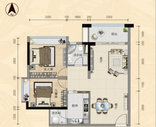 69㎡两房两厅一卫:户型方正,南北通透,采光通风俱佳,客厅、餐厅、厨房一体设计,布局合理,动静分区清晰,主卧自带大飘窗,既能保证采光,也能享受惬意休闲时光,适合刚需小家庭居住。