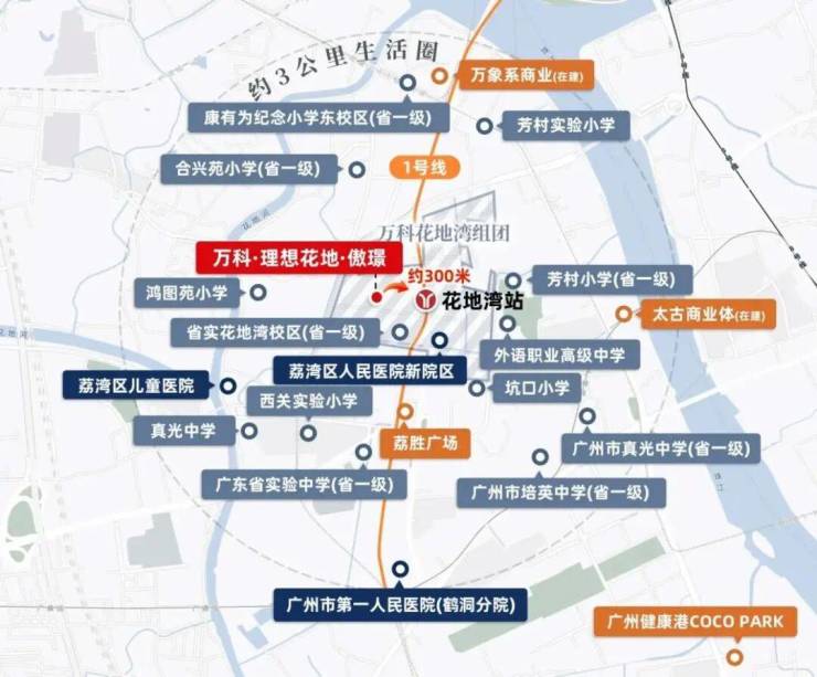 全龄教育闭环:依托万汇天地大盘规划,项目周边还将建设7所幼儿园、3所小学及3所中学,构建起从幼儿园到高中的全龄段教育闭环。虽然初中需参与荔湾区统筹摇号,但丰富的教育资源储备,无疑为孩子的教育提供了更多选择和保障。