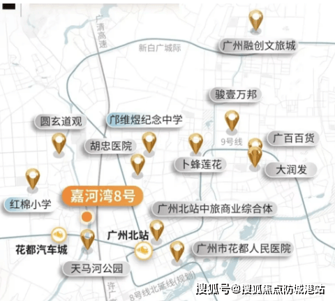 嘉河湾 8 号位于花都区北站新城板块(秀全街道),地理位置优越,东边紧邻天马河,坐拥一线河景资源,同时处于花都重点发展的核心区域,未来发展潜力巨大。交通配套完善,出行便捷:轨道交通方面,最近的地铁站为 9 号线花都汽车城站,距离约 1.3 公里,步行仅需 12 分钟左右,是花都区少有的近地铁项目,通过 9 号线可快速换乘其他线路通达广州各区;道路交通方面,项目紧邻南北走向的荔红路,距离许广高速口不远,向北可途经迎宾大道、花都大道,向南可途经风神大道,自驾出行可快速连接广州城区及珠三角大湾区其他城市;此外,距离广州北站约 3-5 分钟车程,便捷享受铁路交通红利,无论是日常通勤还是跨城出行都十分高效。