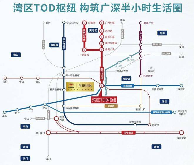 项目坐落在南沙枢纽核心地带,紧邻地铁18号线首发站——万顷沙站。地铁就在家门口,步行几分钟就能进站,4站直达珠江新城,通勤效率很高。加上深中通道万顷沙出口近在咫尺,开车去深圳宝安中心区基本可以控制在半小时左右。这种“地铁+高速”的双快速交通格局,让广州和深圳两大核心CBD都纳入日常半小时生活圈,工作生活两不误。