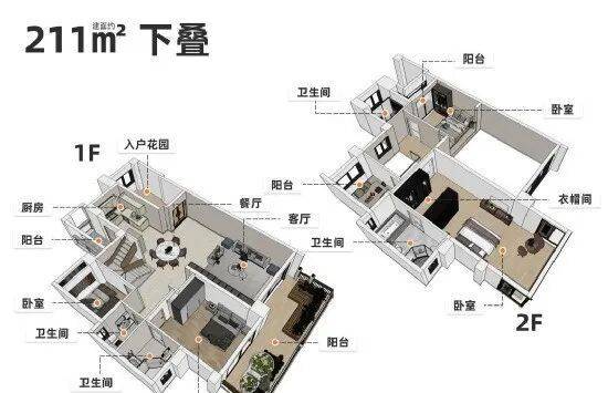203-211㎡花园叠墅:下叠产品自带超大私家庭院与6.3米挑高中空客厅,配备步入式衣帽间、双阳台等奢配,使用率高达200%,堪称滨海低密藏品。