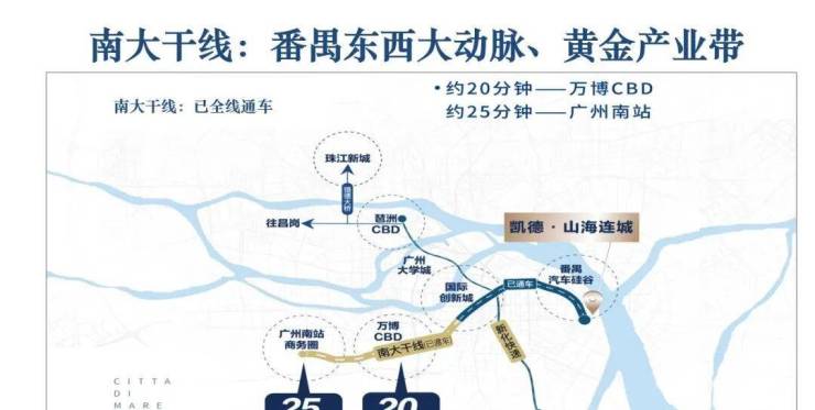 尽管地铁尚在规划中,但得益于南大干线全线贯通,凯德·山海连城的自驾出行优势极为突出。项目出发,约26分钟直达琶洲CBD,30分钟内可达万博商务区、广州南站、大学城等城市重要节点,高效连接广佛都市圈。