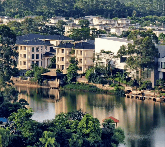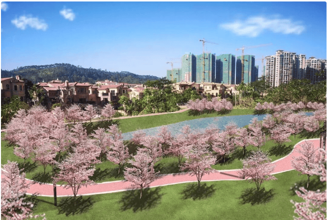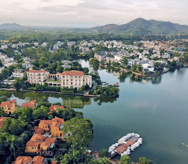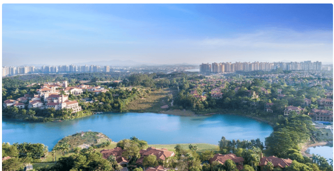 美林湖,占地近9739亩(约6.49平方公里),几乎与珠江新城的面积相当,总建筑面积达到1000万㎡,足以容纳20万人居住。它不仅是一个大型住宅社区,更是集健康、生态和宜居于一身的新城。位于南面的是8000亩天然湖泊,北靠王子山脉,从风水学角度来看,这是一块难得的宝地。