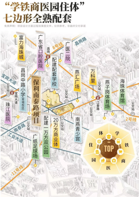 3. 教育配套:配建公立小学(昌岗中路小学领办,纳入昌岗中路小学教育集团),家门口步行3-5分钟可达;初中纳入海珠区公办划片,周边全龄教育资源丰富。