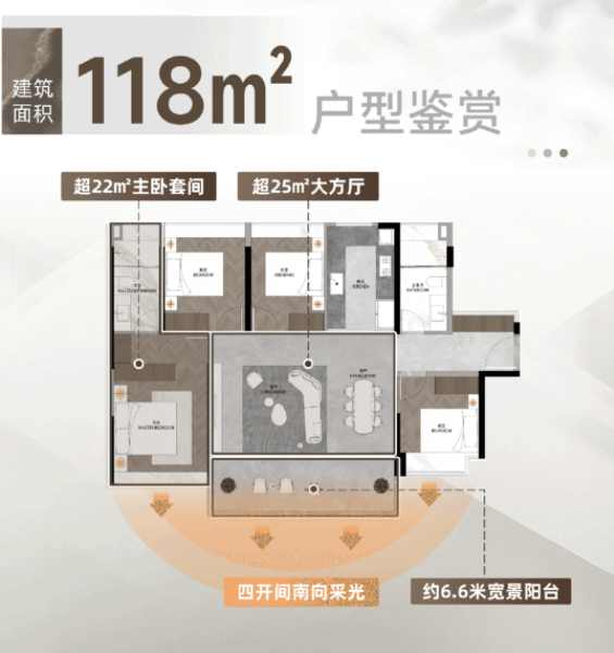 118㎡四房:四开间朝南,6.6米阳台,25㎡大方厅,主卧套间超22㎡,私密性强。