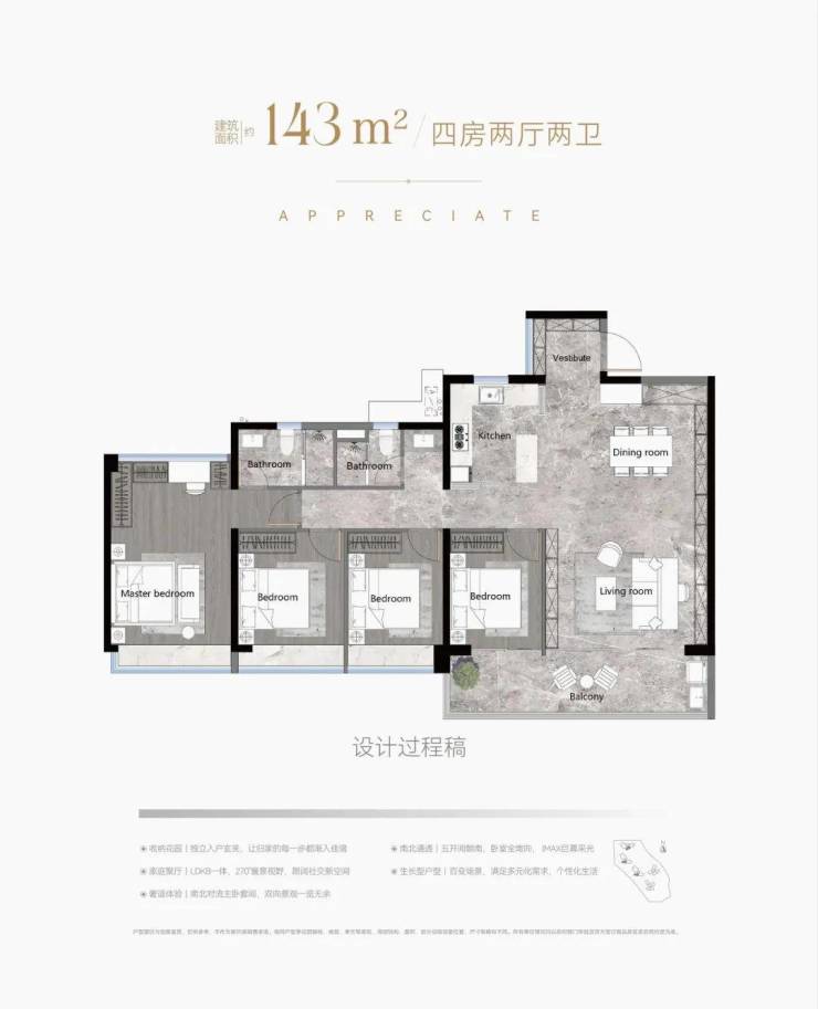 168㎡户型:双套房设计,主卧270°全景飘窗,独立衣帽间与卫浴分离;