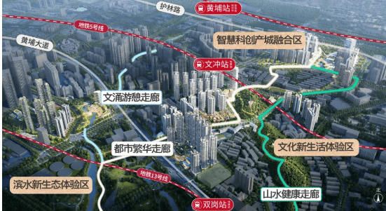 中建未来方洲的地理位置优势显著,项目分为渡头、文元、江北三个组团,均紧邻交通枢纽。其中首开的文元组团位置最为核心,距 13 号线双岗地铁站约 300 米,步行至 5 号线文冲地铁站仅约 500 米,3 站可达金融城,6 站直达琶洲,9 站无需换乘就能抵达珠江新城,双岗 BRT 也近在咫尺。此外,项目临近黄埔大道、临江大道、广州环城高速等城市主动脉,广深沿江高速可快速通达东莞、深圳,规划中的黄埔高铁站还将实现 10 线联通大湾区,多维交通网络让通勤与出行都极为便捷。