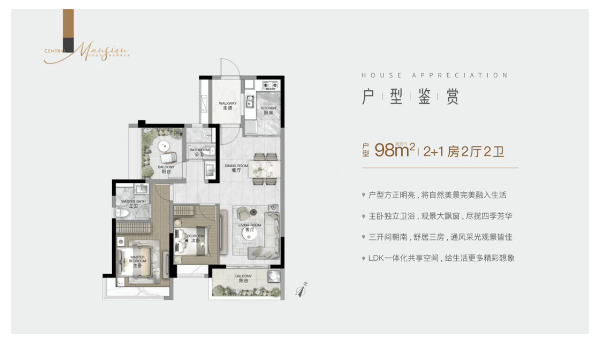 建面约98㎡ 2+1房:三开间朝南,南向采光面达9.8米;主卧带270°转角飘窗;阳台可改造为第三房,赠送面积按政策计一半,得房率极高。