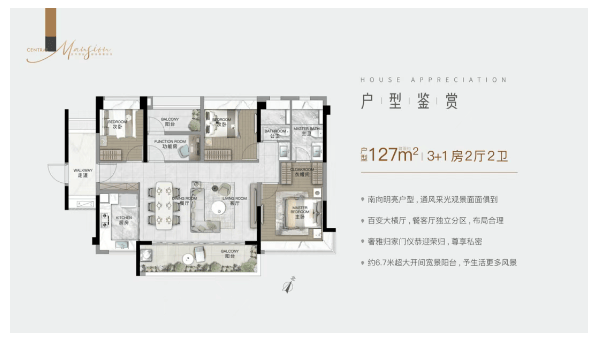 建面约127㎡ 横厅3+1房:四开间朝南,采光面达13.2米;6.8米大横厅搭配双面景观阳台,LDKG一体化设计,社交属性突出。
