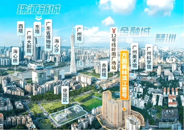 而 **方圆美林滨江壹号** 正好落子于这条中轴线的关键节点——海珠区岭南广场旁,北接珠江新城,南望琶洲人工智能与数字经济试验区,东临珠江航道,西靠艺洲路生活圈,堪称“双CBD+一江景”的黄金交汇点。