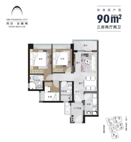 98㎡:3+1室2厅2卫,南朝向,多变空间设计,卧室全飘窗设计。