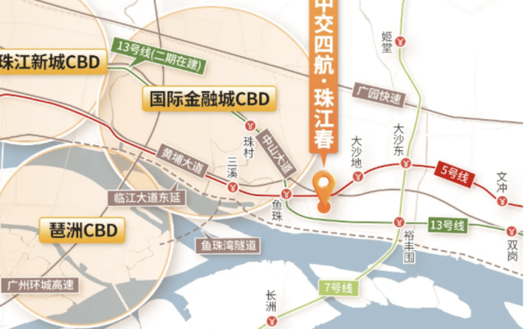 交通方面,中交四航·珠江春堪称“地铁上盖级”项目。项目西面紧邻鱼珠站,步行即可直达地铁5号线与未来13号线二期交汇处。通过地铁5号线可直达金融城与珠江新城,通勤极为顺畅。未来13号线通车后,将进一步强化鱼珠与市中心、南沙、科学城之间的连接。