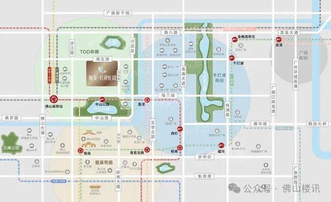 景观资源上,项目南侧为祖庙中心的市政公园——约32万㎡中山公园,约6公里范围内千灯湖公园、文华公园、孝德湖公园、亚艺湖公园密布,悦享稀缺城芯森氧空气。