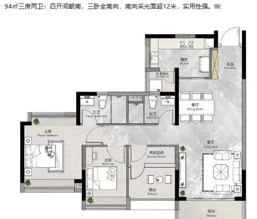所有户型均为全南向或主要功能间朝南,采光充足;