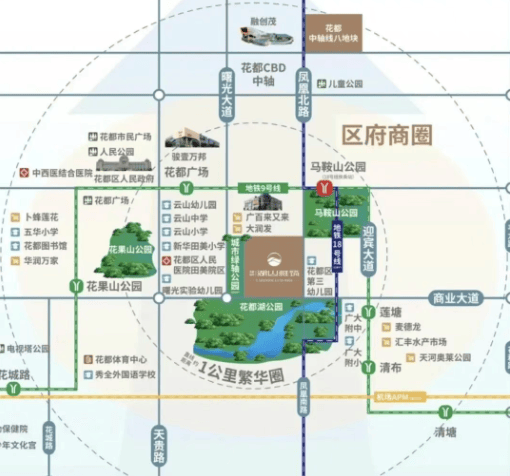 它坐落在花都区府中轴线上,北边800米是马鞍山公园,南边600米就是花都湖国家湿地公园——这意味着你每天下班后,步行十分钟就能走进绿意盎然的自然空间,晨跑、遛娃、拍照都不用出远门。