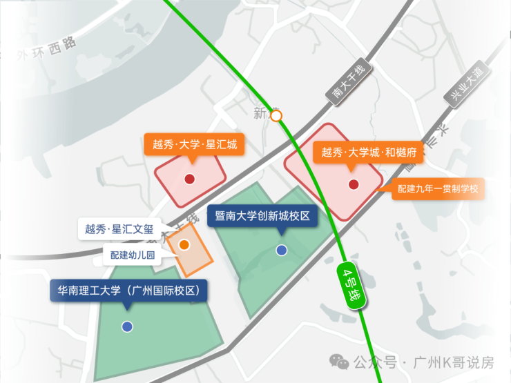 智识高地,同质而居:与暨大、华工国际校区为邻,13所高校环绕、约20万师生聚集,高知人才的聚居地。