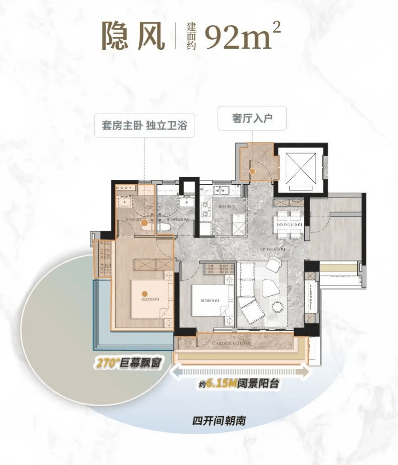 建面约 92㎡户型:奢厅入户,四开间朝南,约 6.15M 阔景阳台,270° 巨幕飘窗。