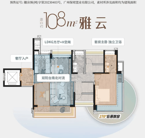 建面约 108㎡户型:奢厅入户,LDKG + X 一体化设计,双阳台,270° 巨幕飘窗。