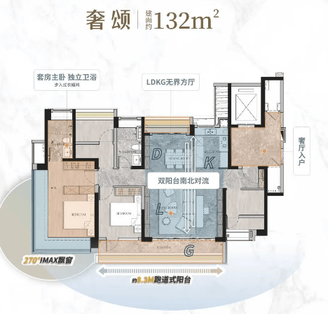 建面约 132㎡户型:奢厅入户,LDKG 大方厅,洄游厨房,约 8.3M 跑道式景观阳台,270° 巨幕观景窗。