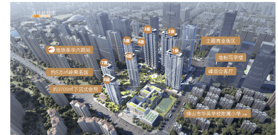 项目位于禅城区石湾亚艺板块核心,紧邻季华六路与文华路交汇处,属佛山主城成熟居住区。整体由两个地块组成,净用地面积约7.38万平方米,总建筑面积约41.5万平方米,规划8栋住宅楼,总户数952户。主力产品以改善型大户型为主,梯户比涵盖三梯两户及早期部分三梯三户设计,强调专梯或低密归家体验。地块二(住宅用地)容积率控制在2.8,属主城低密改善社区;地块一(商住混合)容积率高达6.2,未来将建设约200米商业地标。虽两地块通过盖板连接,但住宅区独立性强,整体营造出圈层纯粹、私密性高的高端住区氛围。