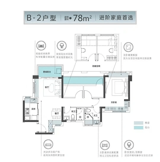 中建凤榕台主打建面约67-89㎡的二至三房,这正是市场主流需求所在。其户型设计普遍特点是:格局方正、动静分区、高使用率、全明设计。我们选取两个代表性户型进行解读: