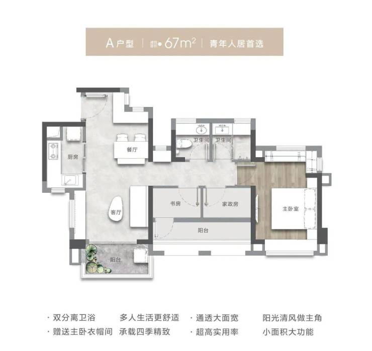 此户型是精巧实用的典范。约67㎡做出舒适两房,功能齐全。