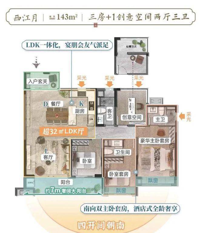 建面约 143㎡ 3 房 + 1 创意空间户型
