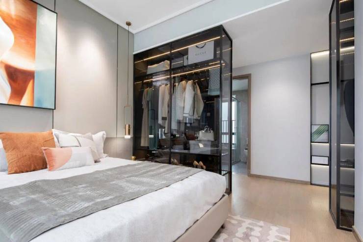 主卧榻榻米上摆放着唱片机,沙发与床相对,空间建立起人与人之间的情感交流。睡前十分钟,放下手机,在沙发上听歌品酒,看窗外夜景,你会发觉世界似乎也很动听。