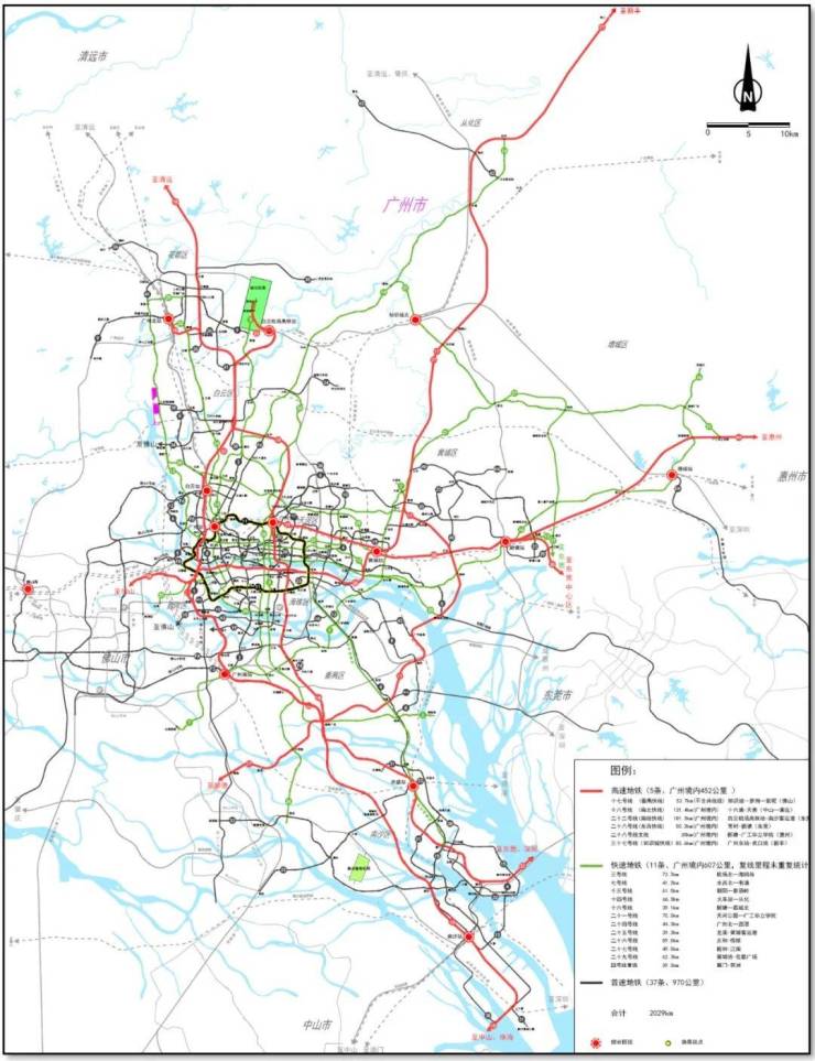 新线网规划显示,广州将打造5条高速地铁(广州境内452公里)、11条快速地铁(广州境内607公里)、37条普速地铁(970公里)形成“高速-快速-普速”三个层级、总里程达2029公里的城市轨道交通线网。