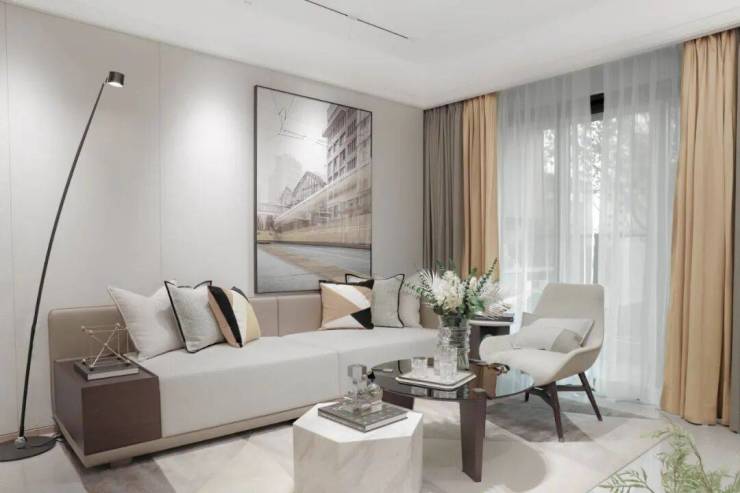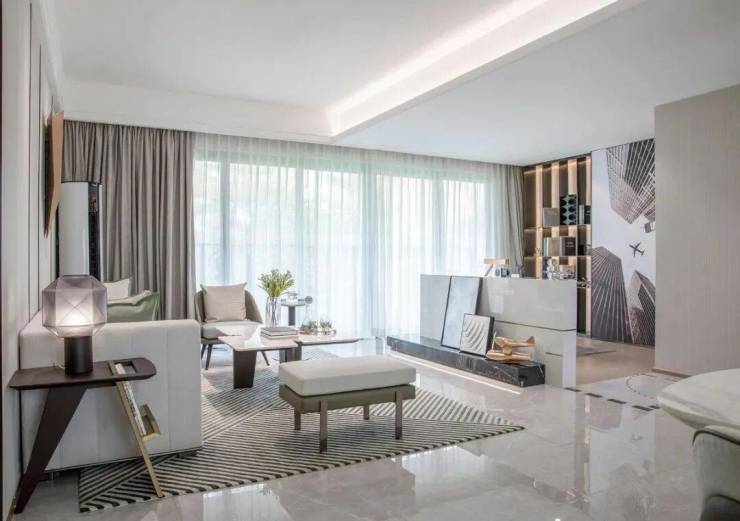 114㎡的旅游样板间更加摩登现代,客厅以黑白灰为主色调,低调优雅,明亮的黄色跳跃其中,让人眼前一亮。