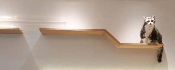 墙上跳板与置物架高低错落,为猫咪提供安全又具有趣味的垂直空间,让这份相互治愈的陪伴,变得更加可爱与温馨。