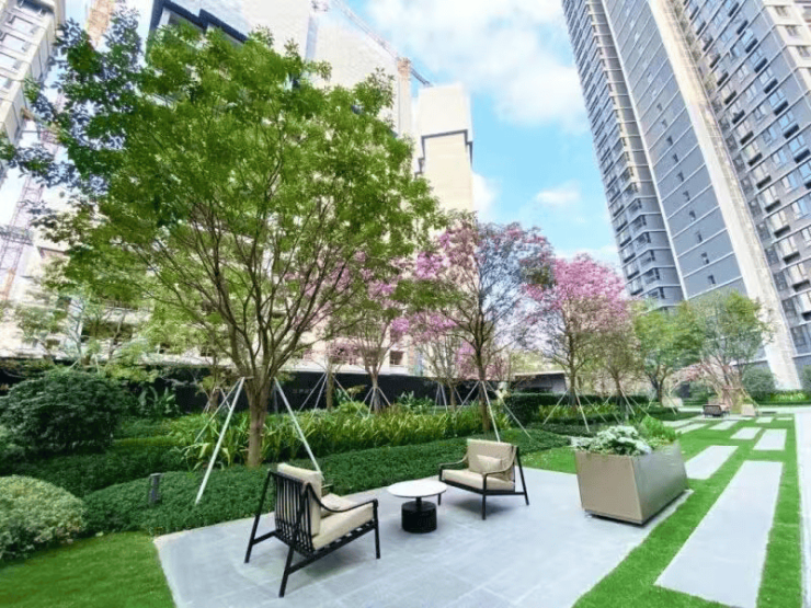 走进顺德悦府二期,仿佛步入一座“可居住的园林”。项目整体抬高约3米,配备自动扶梯与垂直电梯,实现全龄无障碍通行。园林以“岭南森居”为魂,借鉴清晖园手法,打造“八院”主题空间——如“读云水院”以幻影蓝奢石与透光大理石材构筑下沉水镜,倒映天光云影;每栋楼下设私享院落,供邻里社交或独处品茶。植被层次丰富:凤凰木、朴树为骨干,红果冬青、乌桕点缀四季色彩,紫色风铃木花箱沿步道绽放。架空层更非简单通道,而是按楼栋主题打造书吧、会客厅、健身房等功能空间,搭配岭南镂空花窗,自然与人文交融。外部则被6.3万㎡驹荣万象公园、桂畔海滨水绿道环绕,晨跑、遛娃、太极皆有专属场地。