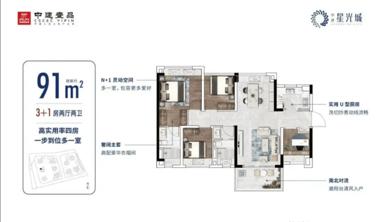 对于人口较多的改善型家庭,91 平方米的南北通透四房户型是终极之选。该户型方正大气,实用率甚至超过 100%,这在同面积段产品中极为罕见。四个房间布局合理,动静分区明确,客厅待客不会打扰卧室休息,保证了家庭的私密性和宁静。