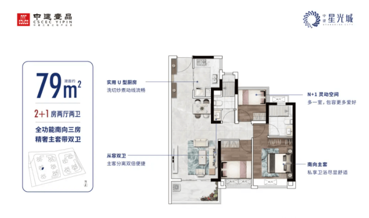 主卧配备独立卫生间,方便夜间使用,同时也保护了主人的隐私。客厅与餐厅相连,空间开阔,适合家庭聚会或朋友来访。厨房设计科学,操作动线流畅,让烹饪成为一种享受。在 2026 年,随着生活水平的提高,人们对居住细节的要求越来越高,79 平米的双卫户型正好满足了这一需求。