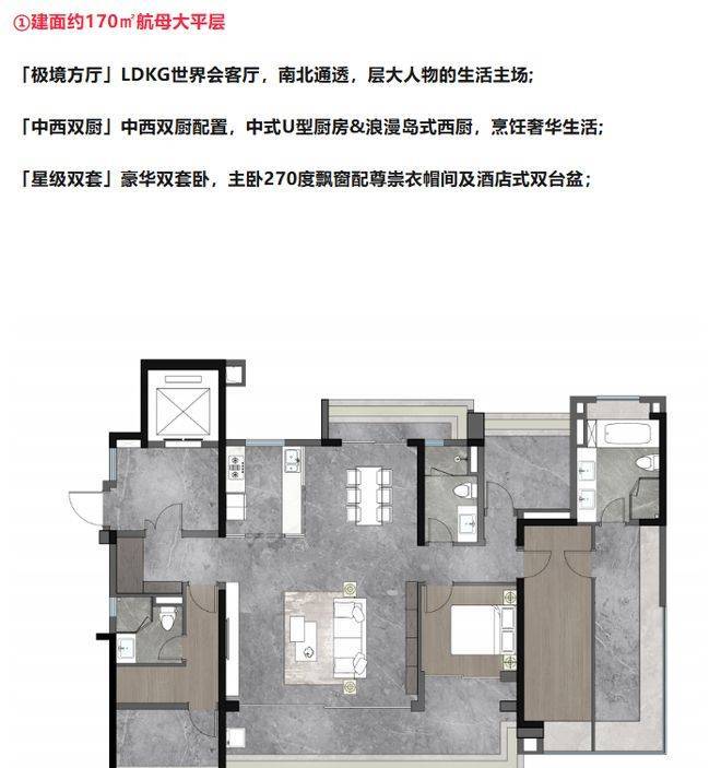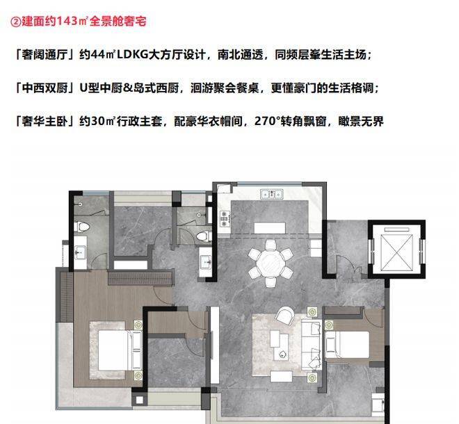 户型设计堪称一绝,107 - 170㎡全景舱板奢大平层,新规户型使用率高达 115%。像 170㎡航母大平层,LDKG 世界会客厅、中西双厨、星级双套卧;143㎡全景舱奢宅,奢阔通厅、中西双厨、奢华主卧;107㎡全景会所奢宅,极致面宽、臻享宽境、优雅美厨。纯南向板楼社区,约 55 米超阔楼间距,保障隐私与视野景观。空间利用充分,居住舒适度极高。