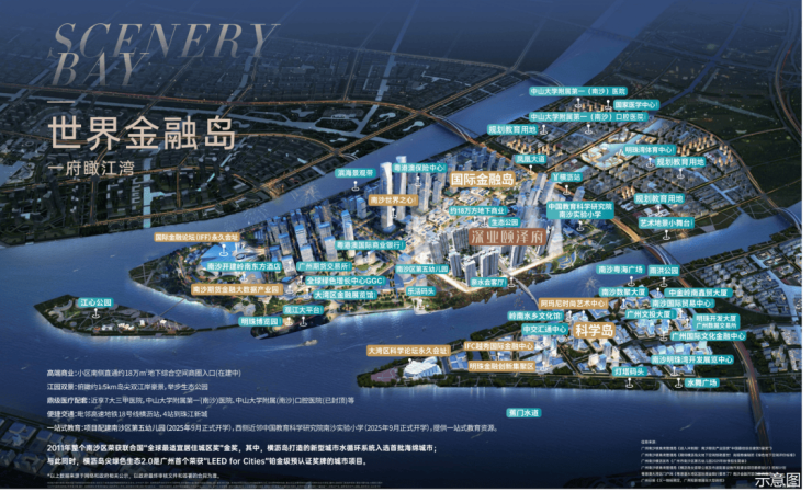 Q2:项目周边的教育配套具体有哪些?学位是否确定? A:项目配建南沙区第五幼儿园(2025年9月正式开学),西侧近邻中国教育科学研究院南沙实验小学(2025年9月正式开学)。具体入学政策请以教育部门当年发布的细则为准。