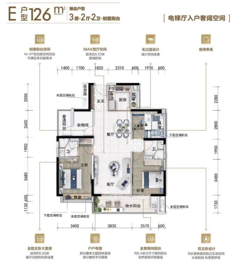 户型设计是碧桂园对佛山家庭生活方式的深度回应。建面约126平方米四房,创新采用“飞机型”格局,客厅与餐厅一体化,连接6.4米超宽阳台,形成约8.23米的IMAX级采光面。主卧配备独立卫浴与步入式衣帽区,两个次卧均满足儿童房或老人房功能,第四房可灵活改造为书房或多功能室。建面约142平方米四房则实现LDKG(客厅、餐厅、厨房、阳台)一体化,南向面宽达6.6米,270度全景视野可同时揽江景与园景。主套进深约7.08米,配置南向大飘窗与双台盆卫浴,尽显豪宅尺度。所有户型均经过上百组家庭访谈与模拟居住测试,确保空间高效利用、动线合理、生活便利。