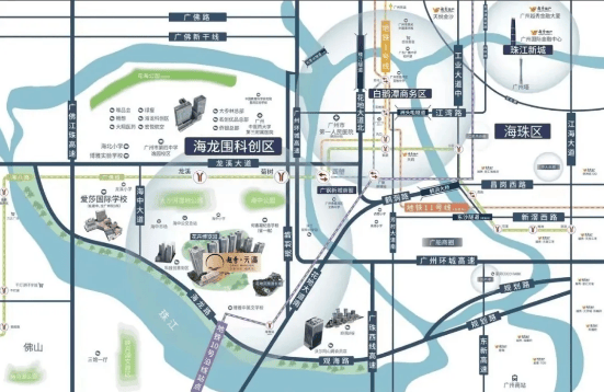 项目配套最大亮点是 “优质教育资源”—— 一路之隔即广东实验中学荔湾学校第三小学部(2022 年已开学),周边有省实一小、二小、华师附小等,自身配建 2 所中学(一所 36 班初中为省实名校,2025 年竣工),板块规划 32 所学校集群,实现 “小学到高中” 一站式教育,家长可实现 “目送式” 接送。商业方面,北区中海花湾天地商圈已醇熟,10 分钟可达星河 Coco Park、广百荔胜广场等,未来还将享广船 125 万㎡综合体配套;医疗方面,4 公里内有 5 所三甲医院,广钢医院正升级为 1200 张床位的甲级医院,健康保障完善。