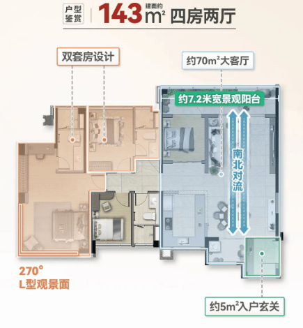 建面约 143㎡户型堪称王炸,超 100% 的使用率在同面积段产品中独树一帜。5㎡玄关位,约 3.6 米宽鞋柜收纳空间,LDKG 设计的客厅,打通隔壁房间后开间达 7.2 米、进深超 10 米,餐厅可轻松容纳 6 - 8 人圆桌。约 7.2 米宽、12㎡的景观阳台,搭配超 50 米前后楼距,视野开阔。双套间设计,主卧套间约 36㎡,270°L 型景观面,采光极佳。